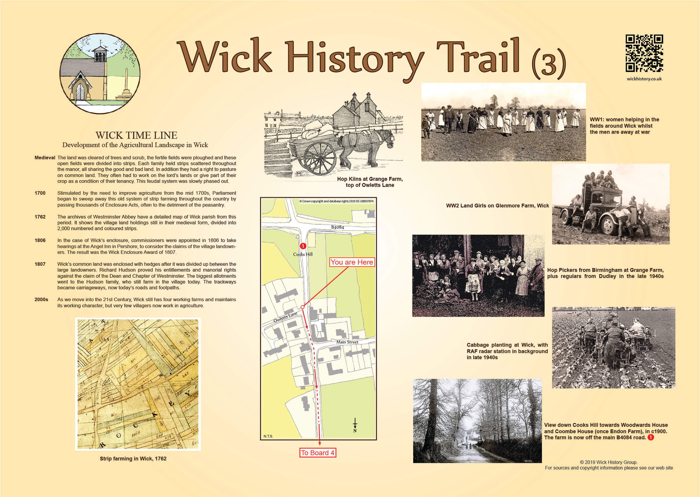 | 1807 | Wick's common land was enclosed with hedges after it was divided up between the large landowners. Richard Hudson proved his entitlements and manorial rights against the claim of the Dean and Chapter of Westminster. The biggest allotments went to the Hudson family, who still farm in the village today. The trackways became carriageways, now today's roads and footpaths. |